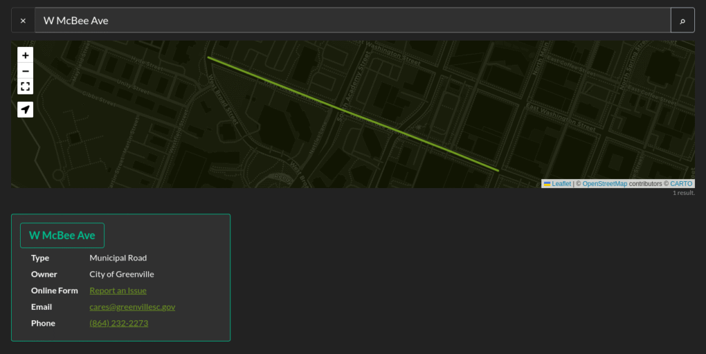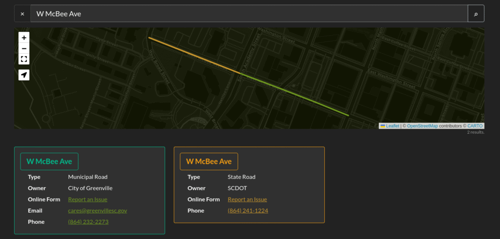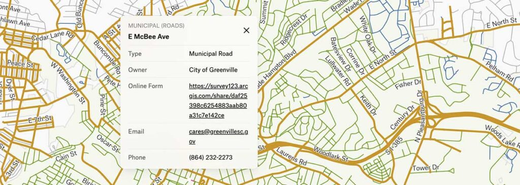 Identifying who owns the road tells you where to submit a maintenance request. For example, if you notice a pothole on Academy Street near downtown Greenville, you might think you should report it to the City of Greenville. Academy Street, however, is a state-owned road, so you should report it to SCDOT.