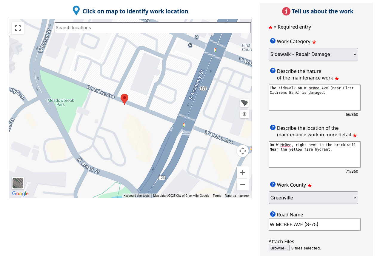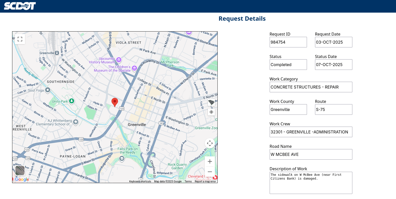 Since then, SCDOT has transferred ownership of W McBee Ave to the City of Greenville, meaning that the same issue would need to be reported to Greenville Cares if submitted today.
